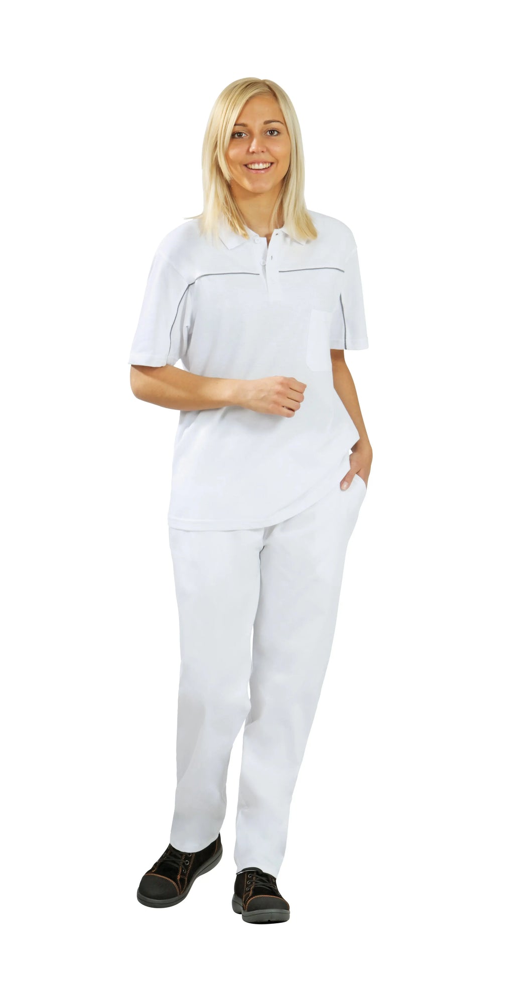 Komfortabler Sitz Ein Arbeitstag kann lang werden: Die Damen Bundhose ist durch den Bund als Gummizug sehr bequem und bietet zwei praktische Eingrifftaschen.
