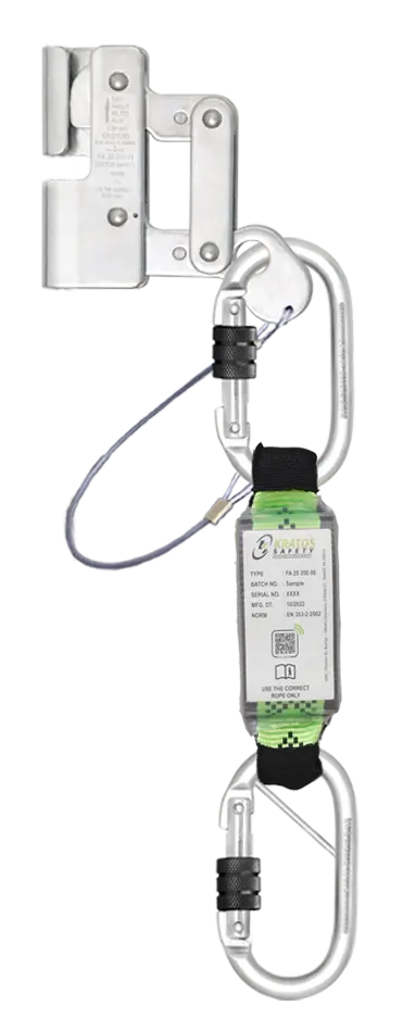 Das am Drahtseil mitlaufende Auffanggerät von KRATOS SAFETY besteht aus rostfreiem Stahl 316 und wird mit einem Bandfalldämpfer geliefert.