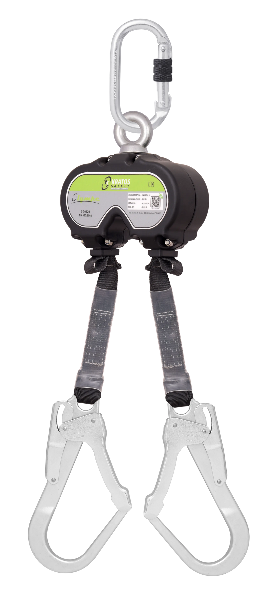 OLYMPE- Twin-Höhensicherungsgerät mit Aluminiumgehäuse bietet sichere Höhenarbeit. Das System verwendet ein 2 m langes 25 mm breites Polyester-Gurtband; es passt sich flexibel an verschiedene Arbeitspositionen an.
