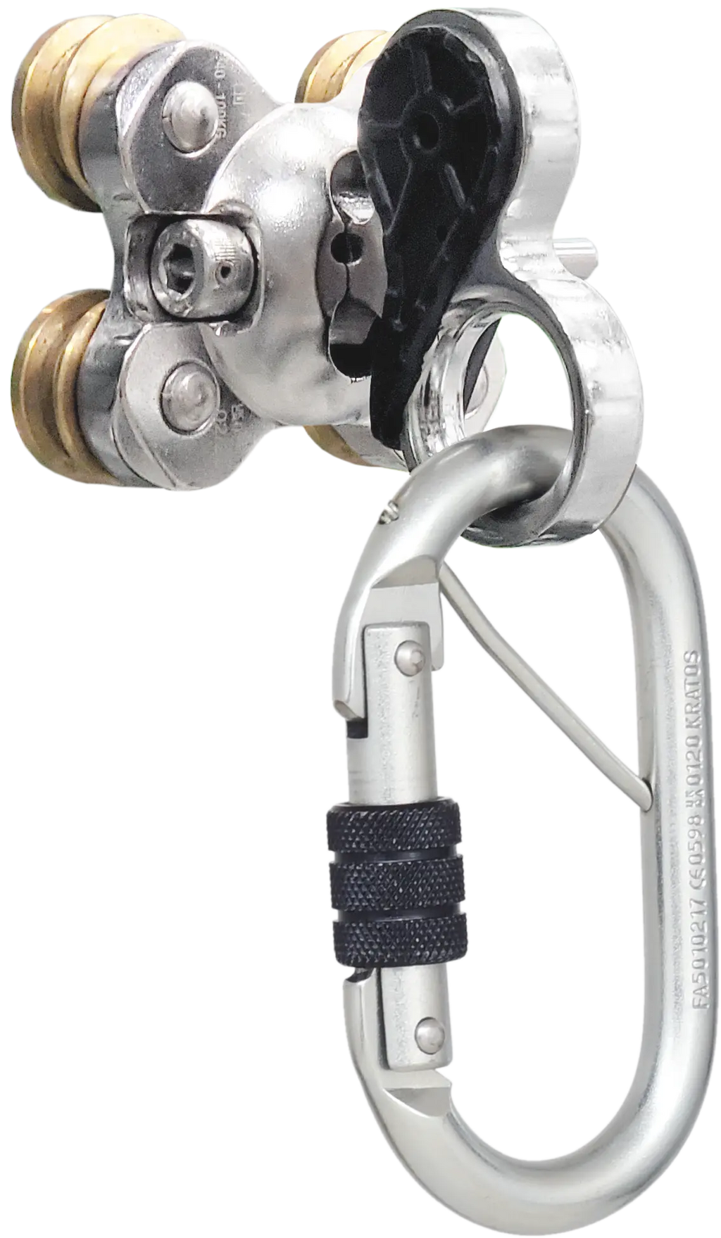 Gleiter/ Vertikale Absturzsicherung auf Rollen setzt auf robuste Materialien und präzise Fertigung. Edelstahl (316) in Kombination mit vier Messingrollen sorgt für eine langlebige, reibungsarme Führung, ergänzt durch eine Sicherungsvorrichtung gegen unbeabsichtigtes Lösen.