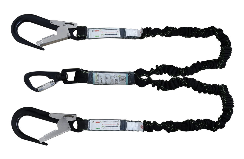 Dieses GRAVITY-S Y-Verbindungsmittel kombiniert elastisches Gurtband mit integriertem Falldämpfer und sorgt so für sanftere Stoppkräfte, mehr Tragekomfort und höhere Sicherheit bei Arbeiten in der Höhe.