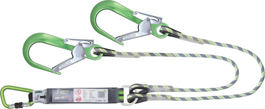 Dieses Y-Verbindungsmittel mit Falldämpfer aus Kernmantelseil bietet eine sichere Verbindungslösung für Arbeiten in der Höhe. Mit einer Länge von 1,50 m und grünen Aluminiumkarabinern ist es flexibel einsetzbar und zuverlässig.