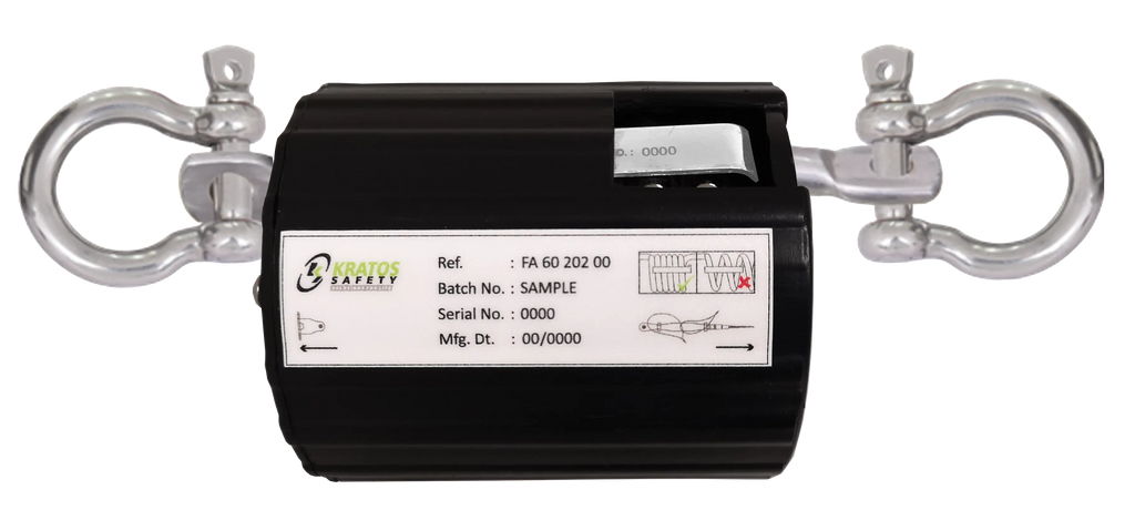Falldämpfer für horizontale Anschlageinrichtung KS 4000 bietet zuverlässigen Fallschutz und sanfte Dämpfung bei Seilsicherung. Der integrierte Vorspannungsindikator 80–100 daN ermöglicht eine einfache Spannungsprüfung.
