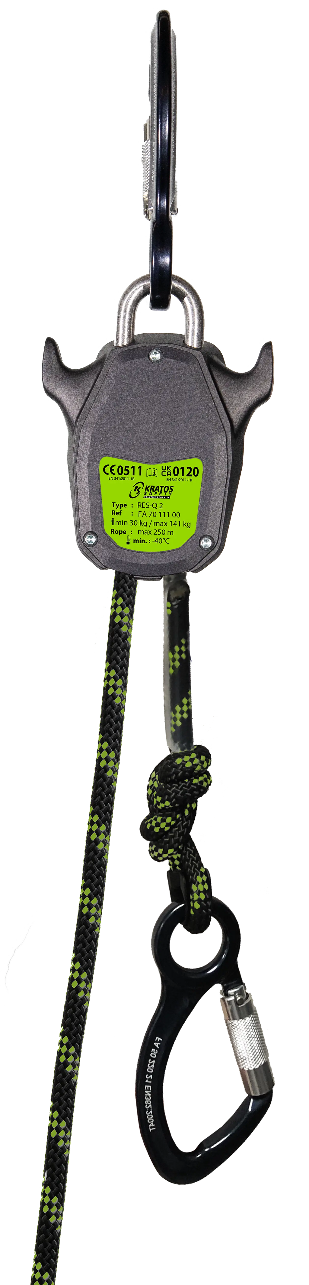 RESC-U ist ein kompaktes Abseil-/Evakuierungsgerät, das schnelle Rettung nach unten ermöglicht. Das Gehäuse besteht aus Aluminium-Druckguss und hochfestem Stahl, montiert mit einem 9,6 mm halbstatischen Kernmantelseil im Gerät. Seilenden sind mit einem doppelten 8er-Knoten versehen, um eine sichere Verbindung mit Karabinern zu gewährleisten. Das Gerät bietet einfache Bedienung und reduzierte Reaktionszeiten bei Notfällen.