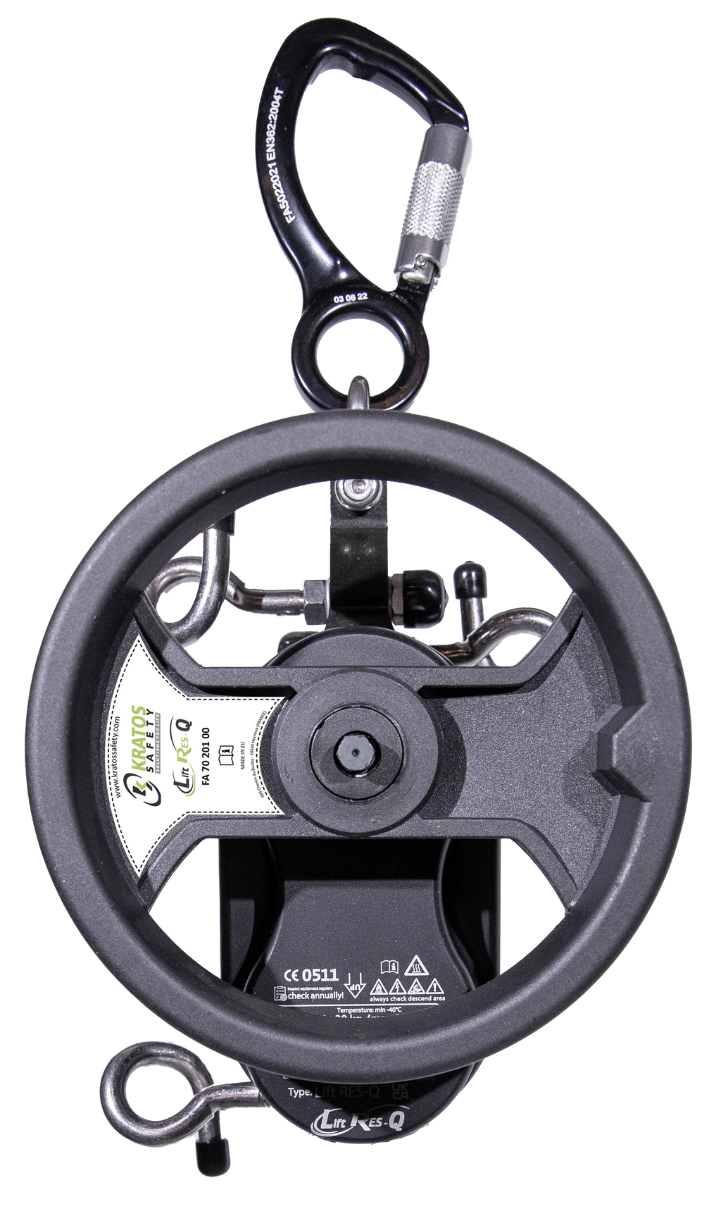 LIFTRES-Q ist das Evakuierungs- und Rettungsgerät für schnelle Einsätze, gefertigt aus Aluminiumlegierung und hochfestem Stahl, ideal für kontrollierte Abstiegs- und Rettungseinsätze. Die Lieferung umfasst 1 Karabiner FA 50 220 21 und eine präzise Sinkgeschwindigkeit.