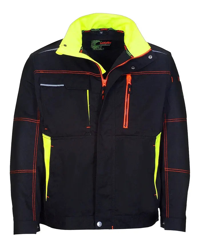 Jacke aus der BLACK - LINE - SerieLeipold-Workwear für Profis! zertifiziert nach OEKO-TEX® STANDARD 100 schwarz mit farblichen Applikationen (neongelb/Leuchtorange) verdeckter Frontreißverschluss, Patte mit Klettverschluss und Druckknöpfen Brusttasche links mit farbigem Reißverschluss Brusttasche rechts mit Patte und Klettverschluss Ärmel links mit Stifteinschubtasche Ellenbogen und Schulterpartien mit Verstärkung aus robustem CORDURA® Ärmel mit Druckknöpfen Klettverschluss zur Weitenregulierung im Bund 2 aufgesetzte Seiteneinschubtaschen mit Reißverschluss diverse dezente ReflexbiesenMaterial Grundgewebe:65 % Polyester + 35 % Baumwolle / Flächengewicht: 240 g/m²Farbige Einlagen (gelb/orange):60 % Baumwolle + 40 % Polyester / Flächengewicht: 245 g/m²Verstärkungen: 500D CORDURA®