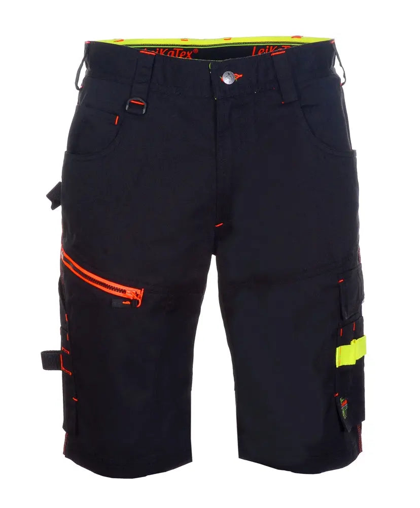 Shorts aus der BLACK LINE - SerieLeipold-Workwear für Profis! schwarz mit farbigen Applikationen (neongelb/leuchtorange) 2 Gesäßtaschen mit Klettverschluss 2 Einschubtaschen, rechts mit integrierter kleiner Zusatztasche Hammerschlaufe seitlicher Einschub für Zollstock, Stifte etc. Oberschenkeltasche rechts mit farbigem Reißverschluss und integrierter Ausweistasche aufgesetzte Werkzeugtasche links mit einem großen Fach und Klettverschluss, sowie drei kleinen Fächern mit Schlaufen in neongelb diverse dezente ReflexbiesenMaterial Grundgewebe: 65 % Polyester + 35 % Baumwolle / Flächengewicht: 240 g/m²Farbige Einlagen (gelb/orange): 60 % Baumwolle + 40 % Polyester / Flächengewicht: 245 g/m²