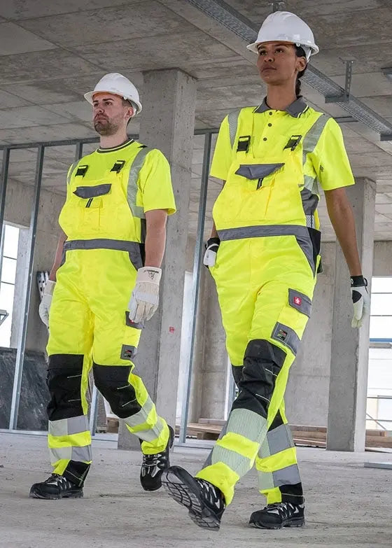Moderne Latzhose aus der BRIGHT LINELeipold-Workwear für Profis! zertifiziert nach EN ISO 20471:2013 + A1:2016 Klasse 2 zertifiziert nach OEKO-TEX® STANDARD 100 gelb mit grauen Applikationen Träger mit Steckschnalle und elastischem Gummibandeinsatz aufgesetzte Brusttasche mit mehreren Fächern und grauer Patte mit Klettverschluss 2 Gesäßtaschen mit grauer Patte und Klettverschluss 2 Seitentaschen, links mit Sicherheitstasche mit Reißverschluss 1 Zollstocktasche inkl. Werkzeug- und Bleistifttasche 1 Oberschenkeltasche mit grauer Patte und verdeckter Handytasche innen 2 Hammerschlaufen aufgesetzte Werkzeugtasche links mit einem großen Fach und Klettverschluss, sowie drei kleinen Fächern mit Schlaufen in neongelb diverse dezente Reflexbiesen Kniepolstertasche aus CORDURA® mit Klettverschluss Verstärkung an der Knöchelinnenseite aus schwarzem strapazierfähigem CORDURA®Material Grundgewebe: 80 % Polyester + 20 % Baumwolle / Flächengewicht: 280 g/m²Verstärkungen: 500D CORDURA®Freifläche für Logos u.ä. : 0,30 m² = 3.000 cm²