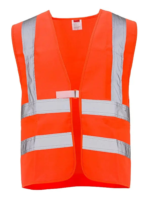 Mischgewebe 20 % Baumwolle + 80 % Polyester Flächengewicht 280 g/m² zwei umlaufende Reflexstreifen + zusätzliche Schulter-Reflexstreifen Bauchweite universell einstellbar Verschluss mit Ring + Klettband EN ISO 20471 - Klasse 2 warnorangeFreifläche für Logos u.ä. : 0,03 m² = 300 cm²
