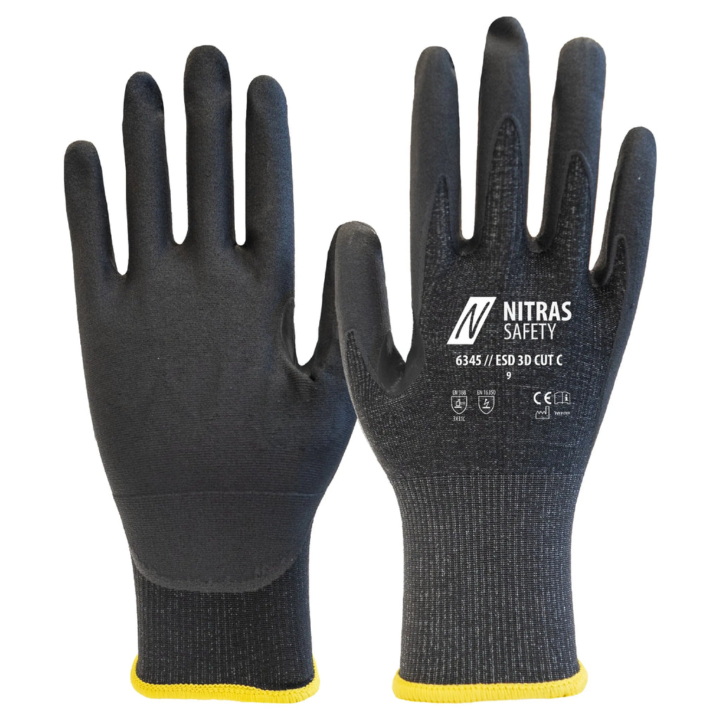 NITRAS ESD 3D CUT C, Schnittschutzhandschuhe, Spezialgarn, anthrazit, eingearbeiteter Carbonfaden, Nitril-Mikroschaum-Beschichtung, schwarz (Farbcode: 1510), teilbeschichtet auf Innenhand und Fingerkuppen, hohe mechanische Beständigkeit, Strickbund, hoher Schnittschutz, perfekte Fingerfertigkeit, perfekte und innovative Passform dank 3D FIT, einzigartiger Tragekomfort und Schutz für den Anwender, 18 Gauge, verstärkte Daumenbeuge, touchscreenfähig, waschbar, Premium-Qualität, antistatisch (ableitfähig), Hautverträglichkeit geprüft (dermatest®), für Lebensmittelkontakt, OEKO-TEX STANDARD 100®, ANSI A3 CUT, sehr rutschfest, perfekter Grip, sehr hohe Abriebfestigkeit, sehr guter Trocken- und Ölgriff, PSA-Risikokategorie II