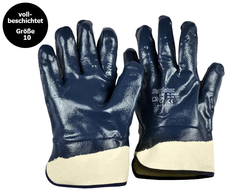 Robuster Handschuh mit starker Nitril-Beschichtung und Baumwoll-Jerseyfutter geeignet für Umgang mit rauen und abriebintensiven Materialien hervorragende Reißfestigkeit Stulpe vollbeschichtet Größe 10